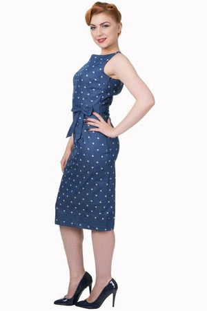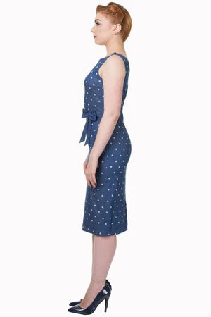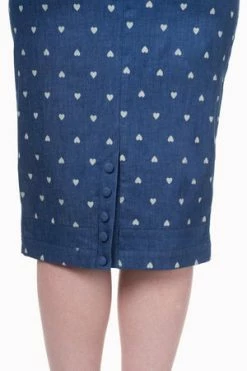 A phenomenal, rockabilly, sleeveless denim dress style from Banned Appare, the “sweet treat pencil dress”, with a fabric belt at the front, back leg split with button details, a contrasting, white hearts print and a hidden zip at the side to fasten.