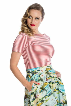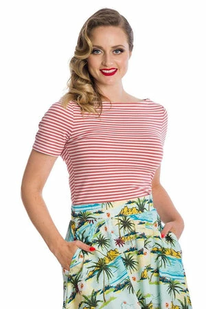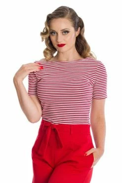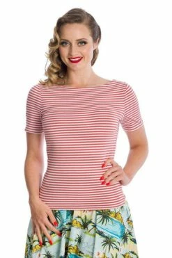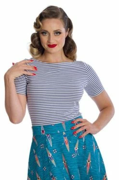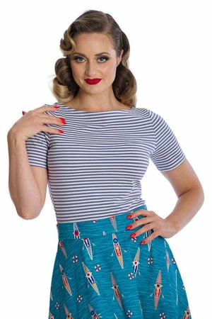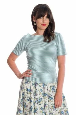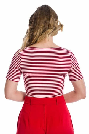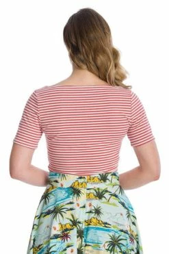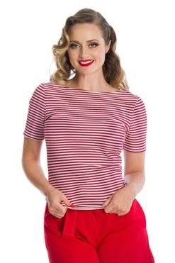 The retro top has a crew neckline, stripe design, short sleeves and a figure accentuating fit.