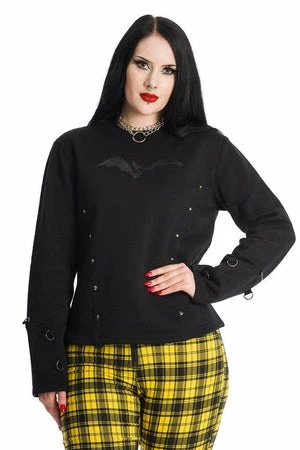 The gothic sweater has bat design, stud and eyelets detailings, crew neckline, long sleeves, ribbed cuffs and a figure accentuating shape.