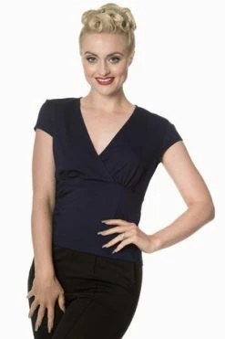 This is an amazing, vintage, ladies short sleeve top designed by Banned Apparel, the temptress top, in black or navy, with a V neckline, short capped sleeves and pleating under the bust.