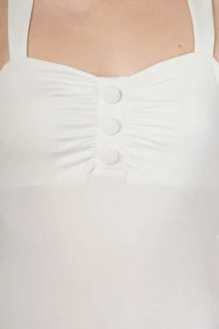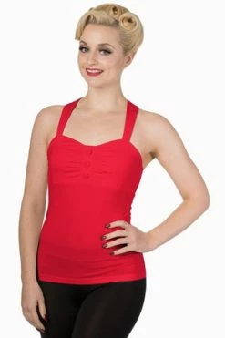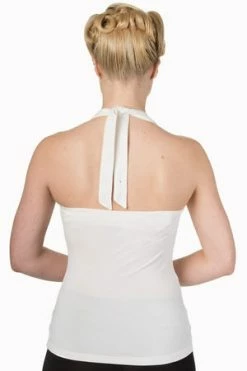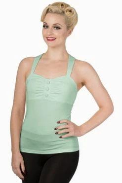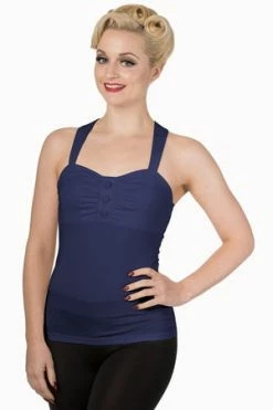 This is a superb, rockabilly, ladies sleeveless halter neck top from Banned Apparel, called “this moment top”, with pleating and decorative buttons at the bust and it is available in a choice of lovely colours, off-white, black, mint, navy or red.