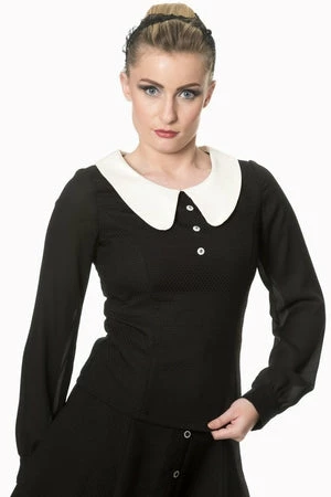 An awesome, gothic, ladies long sleeve top design by Banned, the “till dawn collar blouse”, in black with a white collar and button details.