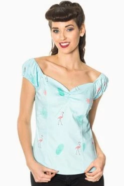 Check out this spectacular, ladies, rockabilly, off the shoulder, short cap sleeve top from Banned Apparel, the “time lapse top” in light blue with a flamingos and feathers print.