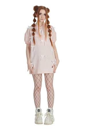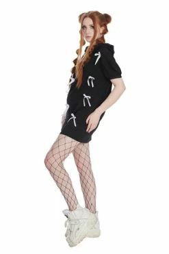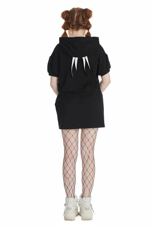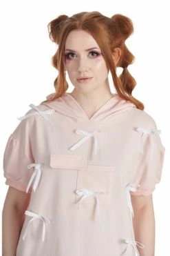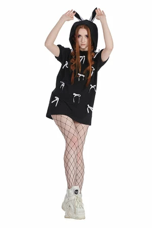 The gothic hoodie has bow detailing, back hood with rabbit style ears, a crew neckline, short sleeves, zip closure, ribbed hem and cuffs detailing and a figure accentuating fit.