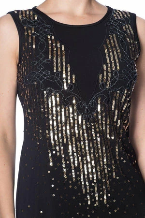 This vintage style dress has a vertical stripe sequin design, a crew neckline, a figure accentuating fit and it fastens with a zipper at the back.