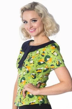 Pair this enticing rockabilly top from Banned Apparel, with a retro skirt and block heels to complete your sixties look! The style is available in plus size also.