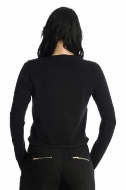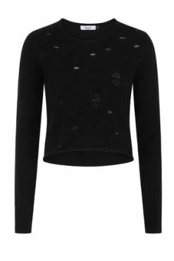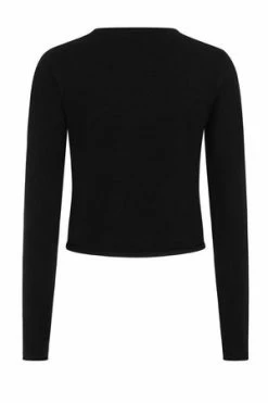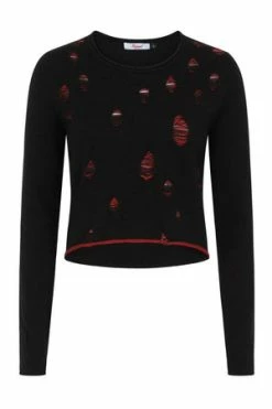 The style has cat themed print, ribbed cuffs and hem, crew neckline, long sleeves and a figure accentuating shape.