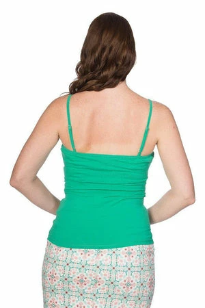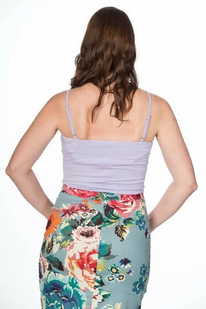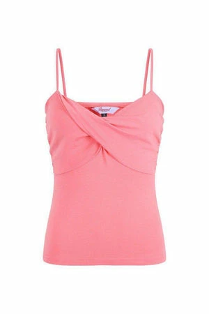 The wrap front vest has a sweetheart neckline, spaghetti straps and a figure accentuating shape.