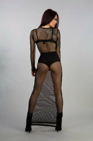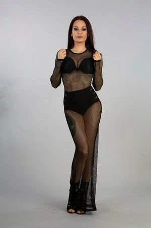 This Adrianna long, high quality, fishnet black dress a flattering fit.
