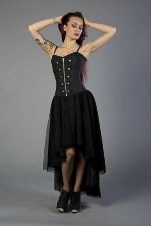 This Gypsy Victorian gothic corset dress has taffeta detailing, mesh skirt with front zip and military style silver buttons and back lace fastening with modesty panel.