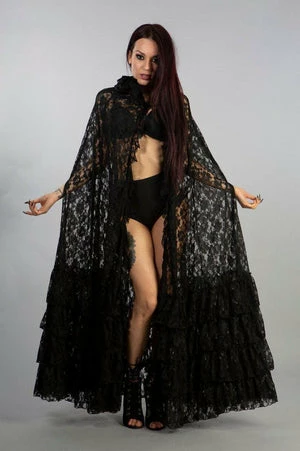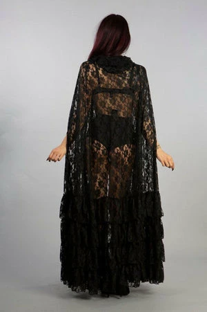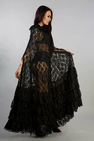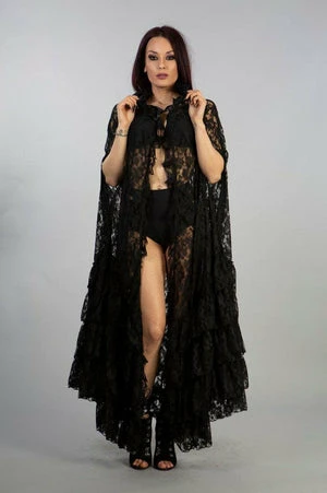 This Mademoiselle maxi length, gothic Victorian hooded cape has fine lace, multi-layered on the bottom, a flattering fit ad it fastens with satin lace.