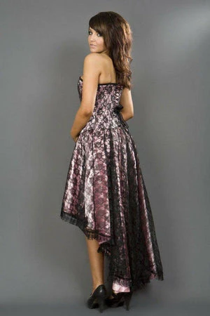 This Mollflanders victorian goth corset dress has black lace overlay, laced ribbon detail, side zip fastening and back lace fastening with modesty panel.