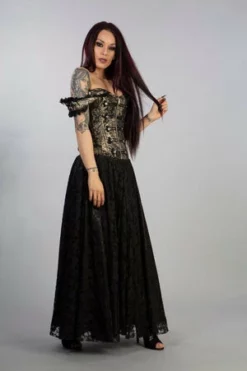 This Paula victorian gothic corset king brocade dress has black satin lace overlay skirt, front zip and military style silver buttons off shoulder straps, laces and modesty panel at the back.