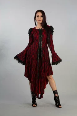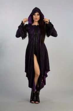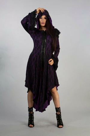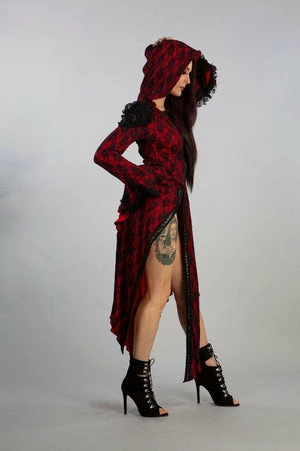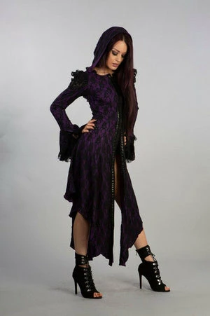 This Pentagram cotton and black lace overlay, maxi dress has a long hood, cut-out detail, flared sleeves, front slinky split, a flattering fit and it fastens with zipper at the front.
