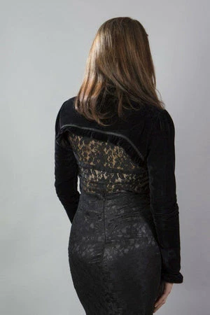 This Raven gothic black velvet flock bolero jacket has black lace frill details and a flattering fit.