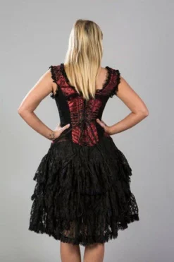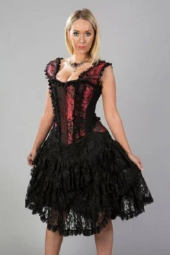 This knee length, Sophia burlesque corset dress has king brocade, black lace frills, front zip detailing and back lace fastening with modesty panel.