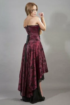 This high low, satin, Valerie Victorian corset dress has black floral flock, laces detailing, ruffled black georgette front panels and back lace fastening with modesty panel.