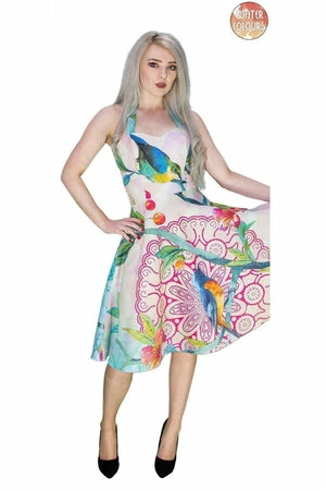 The sleeveless non-stretch midi dress has birds and flowers pastel print, halter neck, strap detail and a figure accentuating shape.
