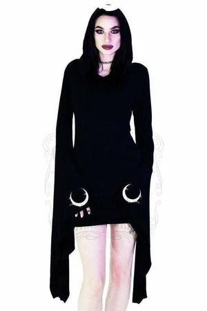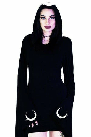 The jersey mix, Bodycon black midi dress has hood and arms dripping crescent print, oversized sleeves and a figure accentuating shape.