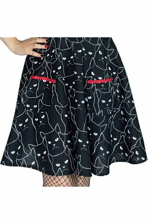 The sleeveless non-stretch black mini dress has white grumpy cats print, halterneck tie, sweetheart neckline, front red faux buttons, red piping detail, two front pockets and a figure accentuating shape.