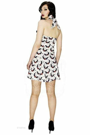 The sleeveless stretchy mini dress has flying hearts and bats print, halterneck tie, sweetheart neckline and a figure accentuating shape.