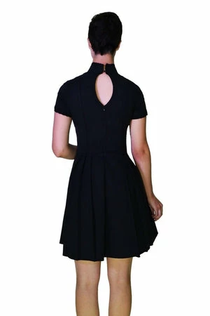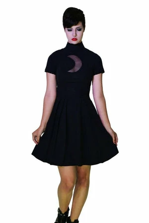 The stretchy black mini dress has see-through moon crescent print, key hole back., short sleeves, lace trim, a figure accentuating shape and it fastens with a hidden zipper.