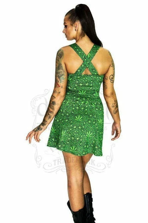 The sleeveless stretchy green dress has Marijuana leaves print, halterneck tie and a figure accentuating shape.