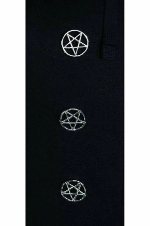 The black cotton hoodie has silver metal pentagram buttons, high neckline, long sleeves, a regular fit and it fastens with a zipper at the front.