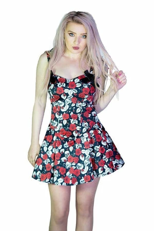 The sleeveless stretchy dress has red roses and skulls print, tied straps, a heart neckline and a figure accentuating shape.