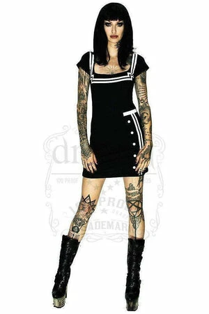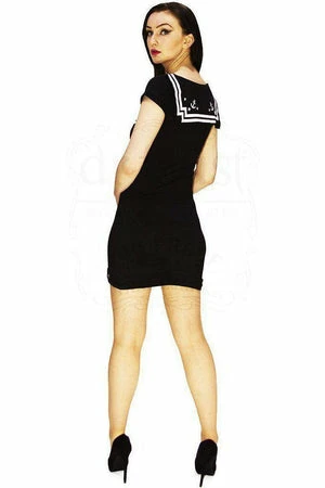 The knitted stretchy, black dress has square sailor white design, a high neckline, cap sleeves, a pencil cut and a figure accentuating shape.