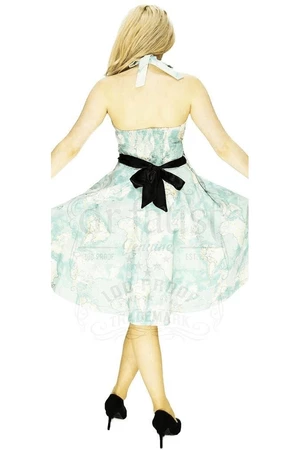 The sleeveless non-stretch, knee length dress has Artisan Map print, halterneck, black waist belt and a figure accentuating shape.
