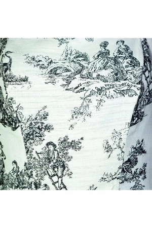 The high low, sleeveless non stretch dress has retro Victorian print, a square neckline, black piping detail, a figure accentuating shape and it fastens with a zipper at the back.