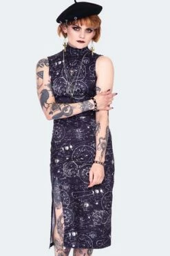 The midi high slit dress has eye pentagram, supersticious cat and symbolic zodic signs design, high neckline, side slit detail and a flattering fit.