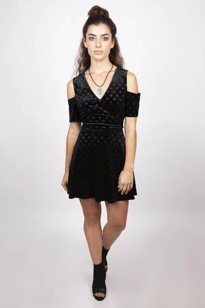 This mini dress has an embossed pyramid themed print in velvet, reflects the moonlight, and A-line skirt, V-neckline and cut-out sleeves.