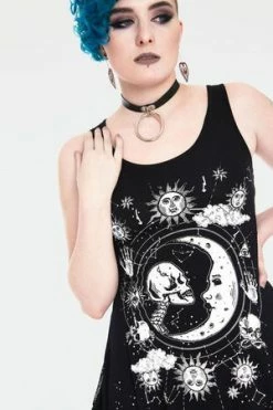 The longline top has sun, moon and symbols print, a round neckline, a flattering fit and skull net mesh back.