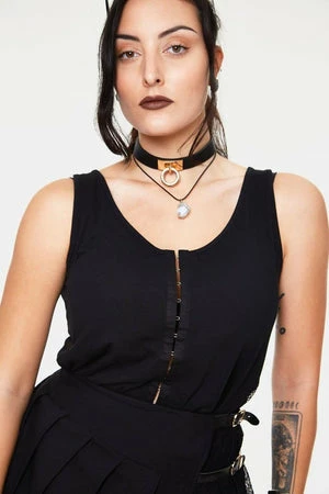 A slammin’ black tank top from Jawbreaker, with hooks to fasten at the front, a scooped neckline and a fishnet back.