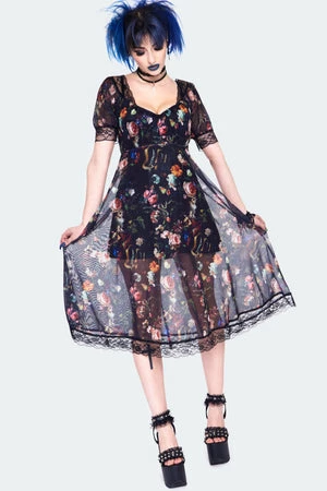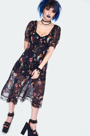 The mini dress has night garden themed design, mesh and lace trim detailing, short sleeves and a flattering fit.