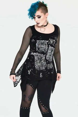 This dark top has evil cats design, back skull net lace detail, a round neckline, long net sleeves and a flattering fit.