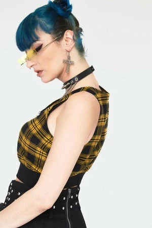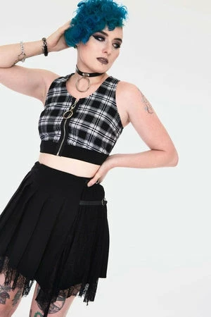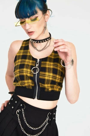 The sleeveless crop top has tartan design, large zip detailing, a round neckline and a flattering fit.
