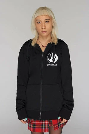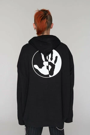A formidable and comfortable, black unisex hoodie from long clothing, which zips up the front and has a black and white hand print with “BY ANY MEANS” caption.