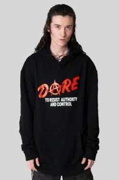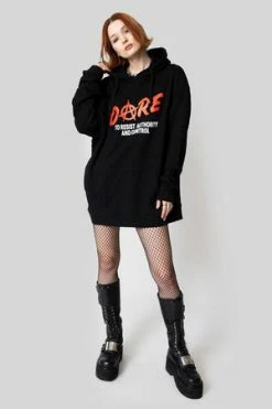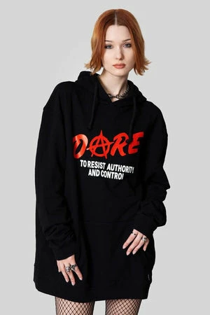 The oversized sweater has ‘Dare’ front print, front pockets, back hood, ribbon tie details and a regular fit.