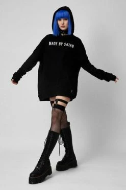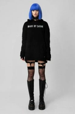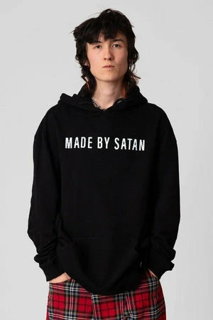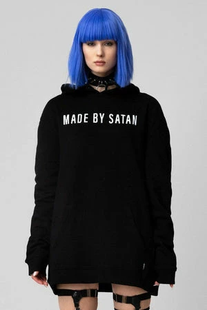 The oversized sweater has ‘Made By Satan’ front caption print, front pockets, back hood, ribbon tie details and a regular fit.
