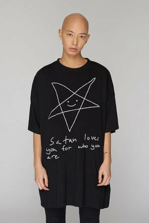 The oversized t-shirt has front ‘Satan loves you for who you are’ caption print, star with smiley design, short sleeves, a crew neckline and a regular fit.
