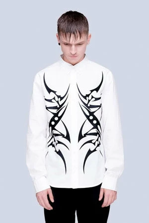 An amazing 100% cotton white, unisex, buttoned shirt from Long Clothing which has a fearsome tribal print on the front.