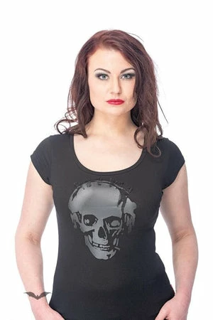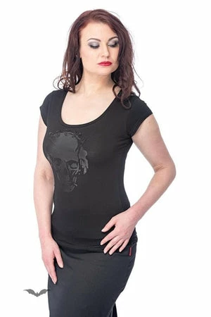 This wicked design by Queen of Darkness is a must for any fan of the night. This short sleeved shirt features a wicked skull print on the front and cropped sleeves. Perfect when combined with hotpants!