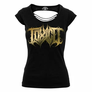 This ladies feminine style t-shirt has gold logo print, V-cut back, a scooped neckline and short sleeves.