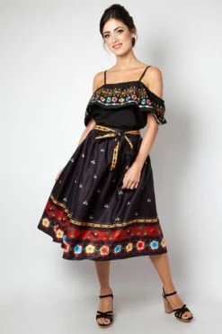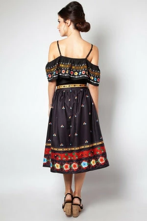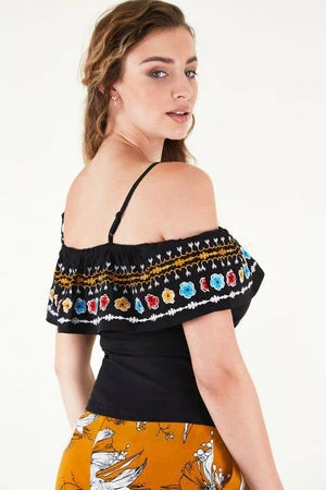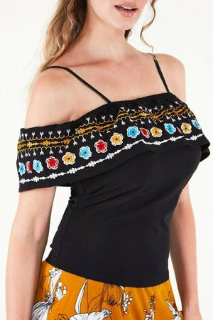 This top has colourful embroidery on ruffle, loose short sleeves, large shoulder ruffle, spaghetti straps and a flattering fit.