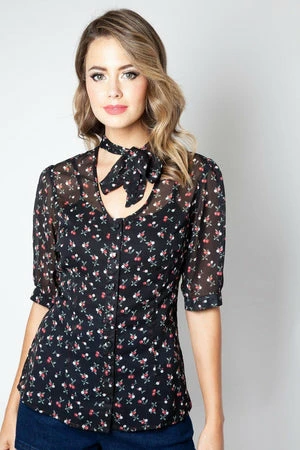 This semi sheer top has an all over cherry print, a U-neckline, short cuffed sleeves, neck tie detailing, a flattering fit and it fastens with buttons at the front.