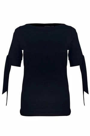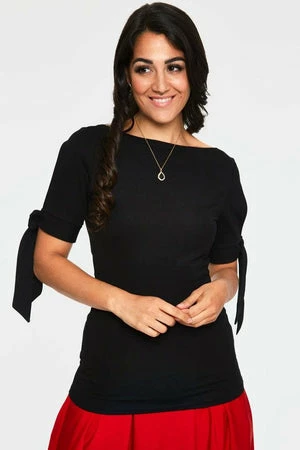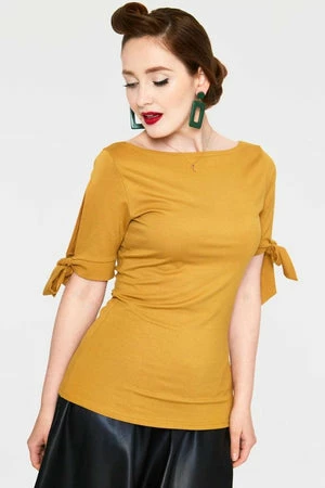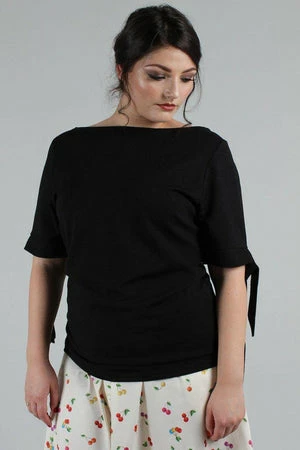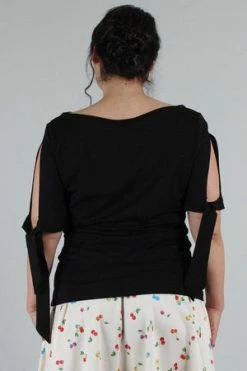 This vintage top has tie detailing on the sleeves, short sleeves, cowl neckline and a flattering fit.