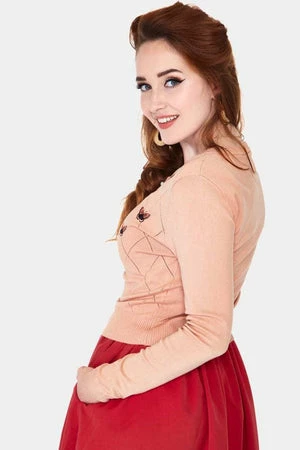 The 50s retro style knitted cardigan has butterfly embroidery, round neckline, key hole cut out detail, full length sleeves, rib hem and cuffs and it fastens at the front with pearl buttons.